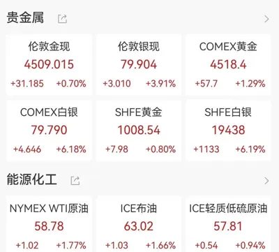 1月9日晚间,美股三大指数盘中拉升,道指涨超100点,纳指涨约0.5%,标普500指数涨约0.4%。 1.存储芯片大涨,科技股普遍上涨。 2.贵金属方面,全线暴涨。现货白银突破80美元/盎司,日内涨4%。 3. 石油也在大涨。消 ...