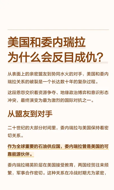 美国与委内瑞拉关系破裂的核心,始于1999年委内瑞拉石油国有化政策触动了美国的经济与战略利益。此后二十余年,双方在资源控制、地缘霸权及意识形态上持续对抗。美国通过长期制裁、政治颠覆和军事威慑,试图改变委内 ...