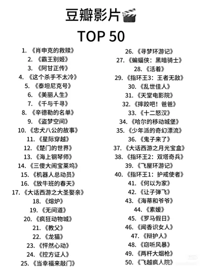 豆瓣电影 Top50 是豆瓣网根据用户评分和评价人数综合计算出的电影榜单,汇集了全球影迷公认的经典佳作,堪称“此生必看电影清单”。 无论是想提升自己,还是单纯想找一部好电影打发时间,这份榜单都是绝佳的参考。 ...