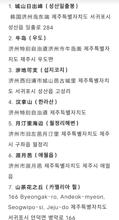 1. 城山日出峰(성산일출봉) 韩国济州岛东端 제주특별자치도 서귀포시 성산읍 일출로 284 2. 牛岛(우도) 济州特别自治道济州市牛岛面 제주특별자치도 제주시 우도면 3. 涉地可支(섭지코지) 济州西归浦市城 ...