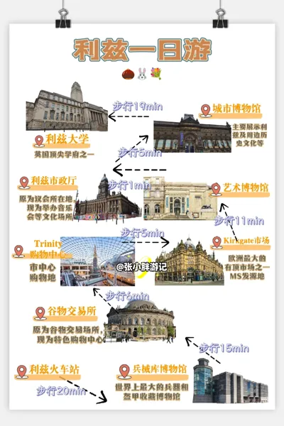 主要景点以及介绍都在图一了,各景点之间步行都能达到,腿着逛一天是合适的 许多博物馆是免费的,但是周一和节假日会休息,注意参观时间和结束营业时间(他们下班都好早啊) 到利兹一个很深刻的印象就是这里有很多 ...