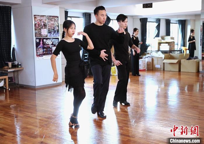 图为台湾职业拉丁舞冠军王毓弘(中)在指导学生。中新社记者 史元丰 摄