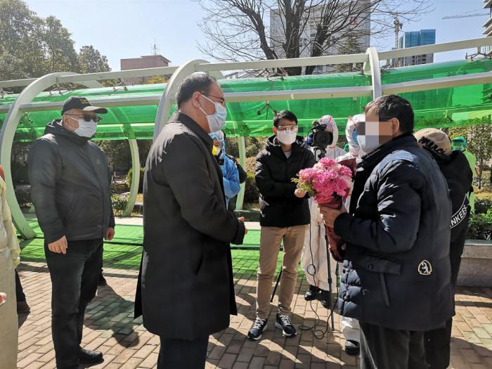 图为湖北省台办主任李建红(左二)在武汉金银潭医院迎接痊愈出院的台胞江先生(右一)。湖北省台办供图