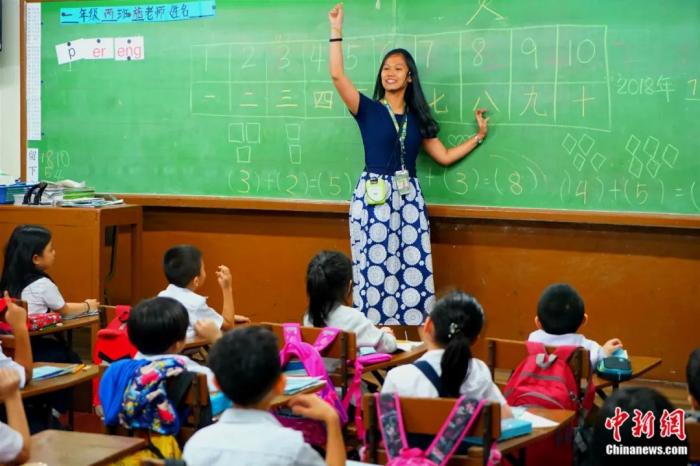 百十年老校侨中学院学生学习华文热情高,菲律宾本土汉语老师在用汉语教算术。关向东 摄