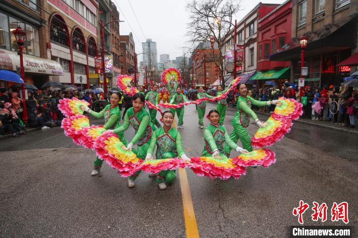 当地时间2月11日,温哥华华埠新春大游行冒雨举行。图为当地华人文艺团体在游行中表演舞蹈。华人网记者 余瑞冬 摄