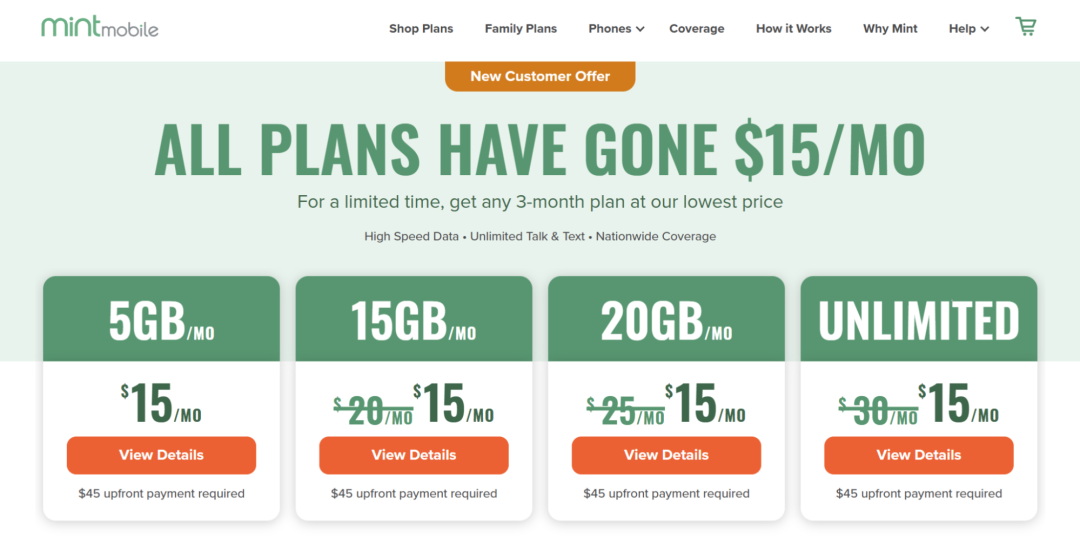 目前,购买MintMobile任意套餐付费3个月,即可以每月15美元的价格畅享所有套餐,需一次性付费3个月。